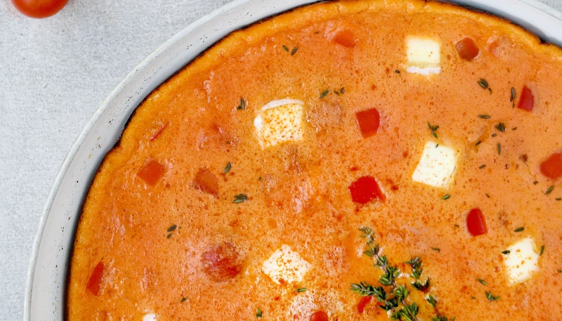 Mixer ensemble, dans un robot : la moitié des tomates cerises, la moitié des dés de poivron, le pesto rosso, une c.à.c d’huile d’olive et les morceaux de fromage. Bien mixer pour obtenir une pâte homogène.
