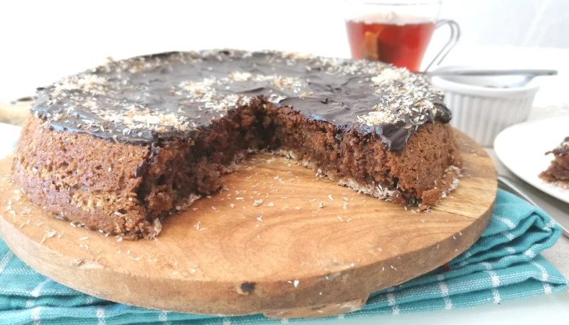 Nappez votre cake de chocolat et Saupoudrez- le de noix de coco râpée.