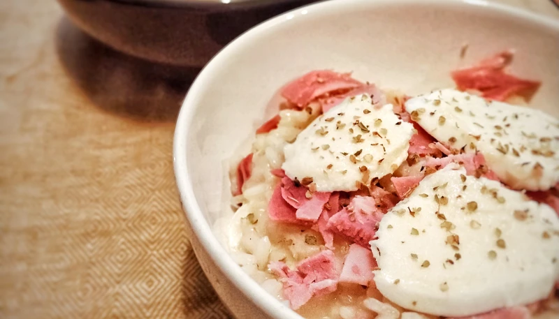 9/ Terminez en rajoutant les morceaux de jambon et de mozzarella juste avant de servir, pour que la mozzarella soit à peine fondue.