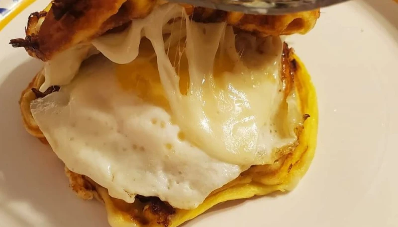 Sur la première gaufre, déposez la tranche d'emmental, l’œuf au plat par dessus, puis refermez avec la deuxième.