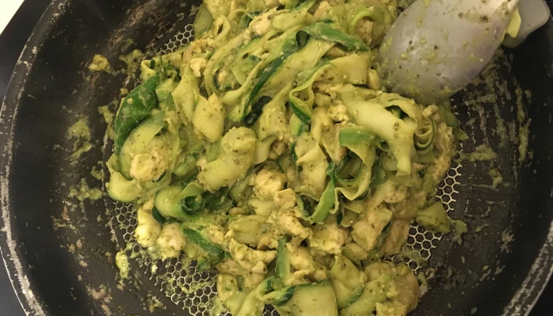 Faire revenir à feux moyen les courgettes dans du pesto (à la place de l'huile) pendant environ 5 min, y ajouter le poulet, laisser cuire. Terminer la cuisson à feux fort pour que le tout dore un peu.