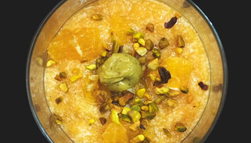 8. Pour le dressage, à l'aide d'une poche à douille, remplissez le fond de la verrine de crème patissière à la pistache et recouvrez là généreusement d'éclats de pistaches. Rajoutez ensuite à l'aide d'une poche à douille la mousse. Enfin, décorez avec des supremes de mandarines, des éclats de pistache et une touche de creme patissière.