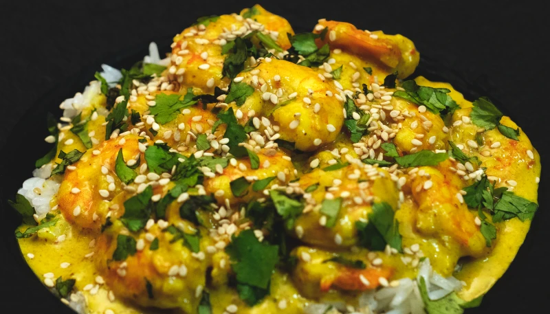 6.On passe au dressage, déposez dans une assiette creuse un peu de riz au sésame puis recouvrez de sauce et déposez quelques crevettes sur le dessus.