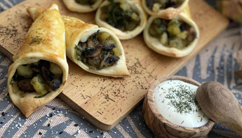 🖇Couper la pâte en forme carrée et l'envelopper (voir la photo) avec le mélange.