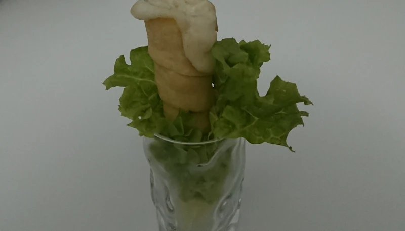 Enroulez vos croustilles de fromage dans une feuille de salade et déposez-les dans des verrines individuelles pour la présentation.