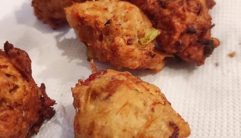 Faire dessaler la morue. Ici on l'a fait trois fois. Couper les piments et l'oignon en tout petits bouts. Dans un saladier, mélanger la farine, les oeufs. Ajouter le lait puis la garniture (piments, oignon, ciboule, morue émiettée). Vous obtenez une pâte qui colle aux doigts 😜