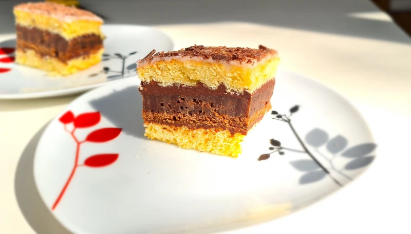Faire cuire le chocolat noir avec la crème, l'étaler sur la première partie du gâteau au yaourt, mettre le gâteau au yaourt chocolaté par dessus, y ajouter de la ganache et finir par l'autre partie du gâteau au yaourt.