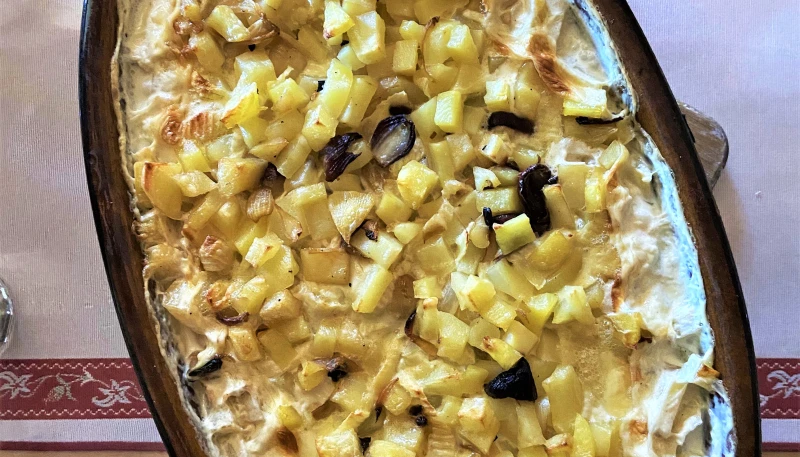 Dans un plat allant au four, alternez les couches du mélange pommes de terre, oignons, champignons, recouvert de quelques lamelles de reblochon. Finissez par le reblochon.