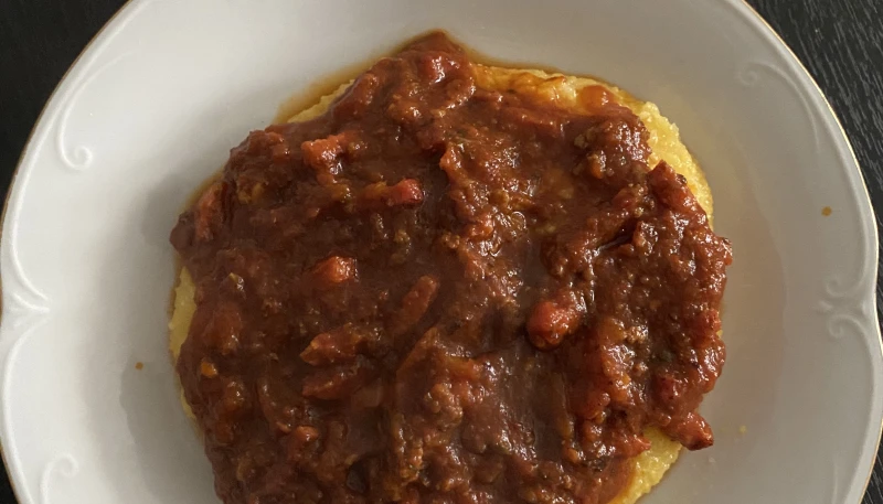 5. Versez une bonne louchée de polenta dans une assiette et étalez, puis recouvrez d'une louche généreuse de sauce tomate. Dégustez aussitôt !