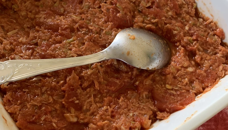 Coupez l'oignon en très petits bout, le faire revenir dans une poêle huilée. Ajoutez, après l'avoir bien faire revenir avec les tomates ( égoutées ), faire mijotés 10/15 min a feu doux en remuant de temps en temps.