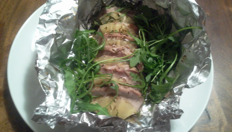 Déposer les tranches de veau en les intercalant avec les triangles d'ananas.