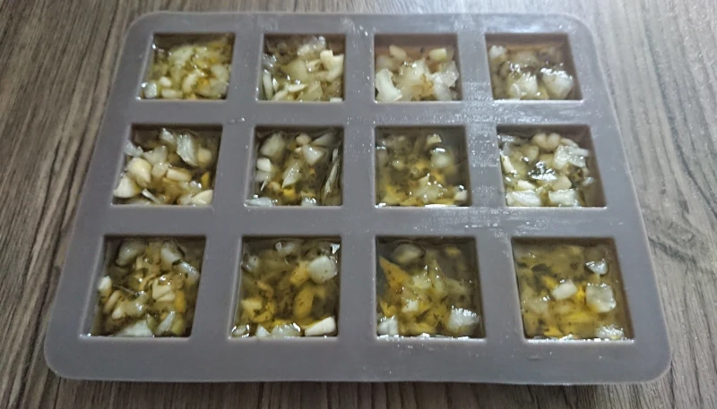 Versez une cuillère à soupe d'huile d'olive au basilic dans chaque petit bac de façon à les remplir jusqu'en haut.