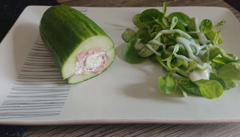 Garnissez chaque demi concombre d'une demi tranche de jambon et remplissez de fromage à l'aide d'une cuillère.