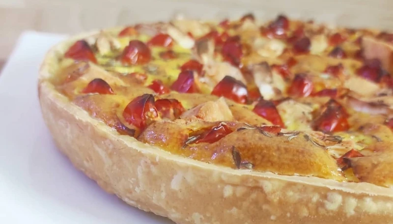 Battre les oeufs et la crème. Ajouter sel poivre thym. Réserver. Étaler la pâte sur le moule à tarte. Disposer les tomates cerises préalablement entaillées (voir photo). Découper la buche de chèvre en petits morceaux et les déposer dans chaque tomate. Recouvrir avec l'appareil à crème. Enfourner four chaud pendant 25 à 30 min à 180°C
