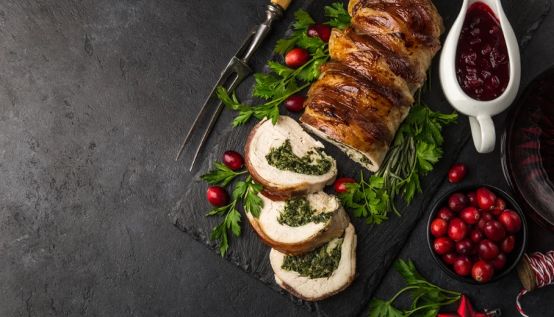 4° Avec un couteau, ouvrir la poitrine de dinde, saler, poivrer et étendre la farce au centre sur la longueur. Rouler pour refermer et ficeler.