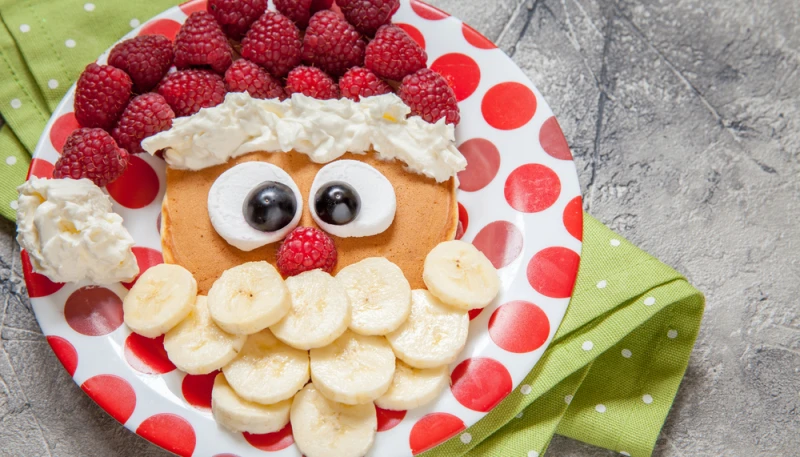 5° Coupez les guimauves en rondelles pour former les yeux, ainsi qu'une framboise en 2 pour former le nez. Disposez le reste des fruits et la mousse de manière à former le père-noël. Servez et bon appétit.