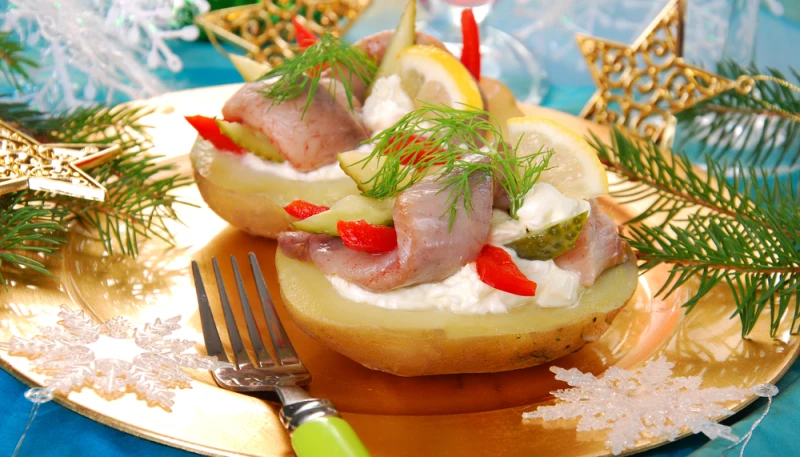 4° Garnissez vos pommes de terre : commencez par 1 càs de crème fraîche assaisonnée, puis déposez 1 lamelle de poisson, avant de finir par 2 morceaux de cornichons et 1 rondelle de citron par pomme de terre. servez, bon appétit.