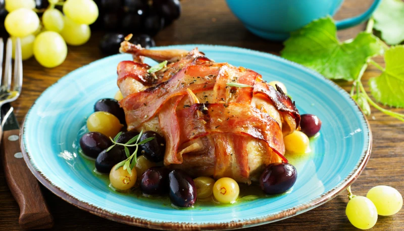 3° Enveloppez les cailles d'une tranche de jambon cru coupée en lamelles, disposez-les dans un plat et enfournez pendant 15 min. Retirez les cailles du four, disposez un peu de confiture d'oignon au milieu des assiettes et ajoutez les cailles. Bon appétit.