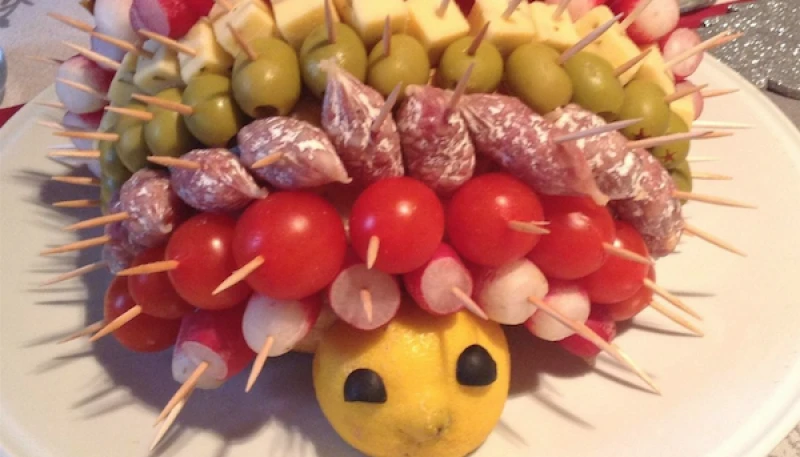 3° Une fois le hérisson monté, piquez profondément 2 cure-dents dans le citron à l'emplacement des yeux, placez-y 2 petits morceaux d'olive noire.