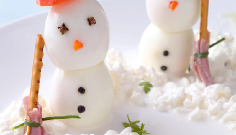 6° Disposez les grains de poivre pour faire les yeux et les boutons. N'oubliez pas un petit bout de carotte pour le nez ! Faites tenir le balai sur le bonhomme de neige.