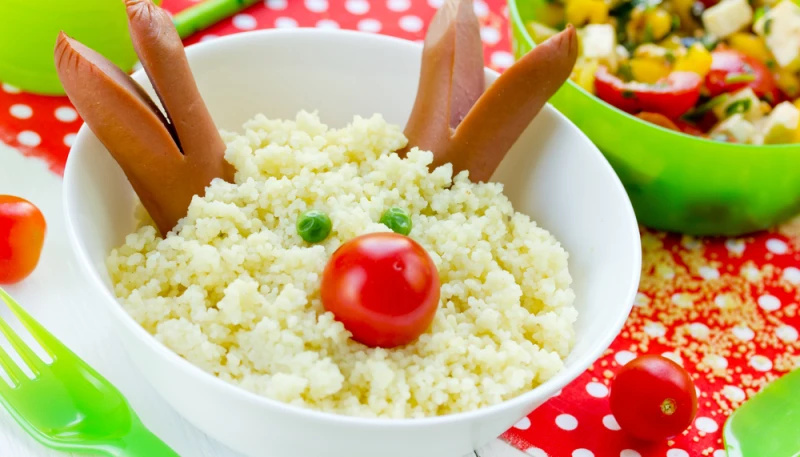 4° Dressage : Mettre la semoule dans une assiette creuse, coupez chaque saucisse en 2 puis entailler un bout des extrémités pour faire les bois du renne. Lavez les tomates cerise, placez-les sur la semoule au niveau du nez et pour finir, placez 2 petits pois pour faire les yeux. servez.