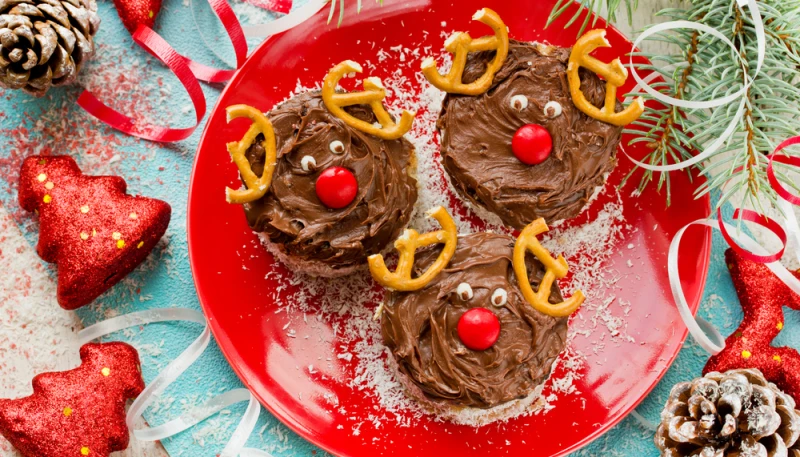 3° Pour la déco, faites fondre le chocolat blanc, formez des cercles ovales pour former les yeux et laissez refroidir. Ensuite déposez-les sur les gâteaux, ajoutez le reste de chocolat noir fondu pour fair les pupilles. Déposez les Smarties au niveau du nez. Cassez les bretzels en deux et placez-les pour former les cornes. Dégustez.