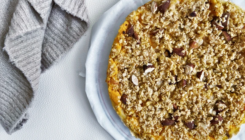 Parsemez le crumble sur votre tarte et enfournez pour 45 min à 180°C.
