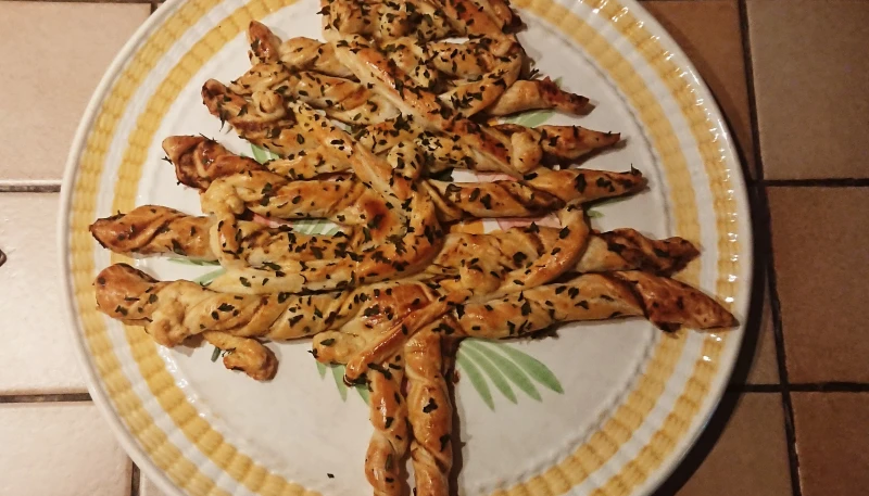 Retournez le sapin, appuyez dessus pour faire ressortir la forme du sapin, puis découpez la forme. Retirez l'excédent de la deuxième pâte. Enroulez chaque branche en les torsadant.