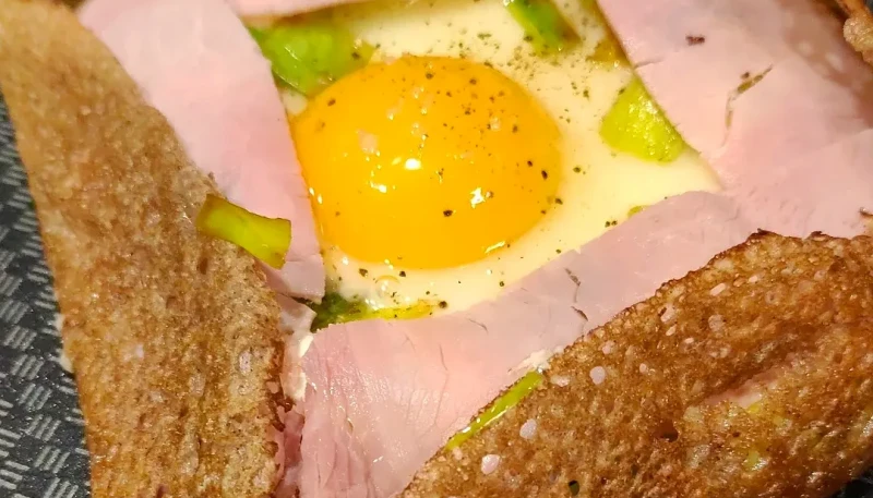 Déposer une noisette de beurre dans le fond de la poêle. Mettre la galette dans la poêle. Ajouter la poignée de gruyère en cercle, casser l'oeuf au centre. Poser les morceaux de chèvre autour. Ajouter le poireau préalablement cuit. Couper une tranche de jambon en 4 lamelles. Saler poivrer et ajouter un peu de piment d'Espelette.