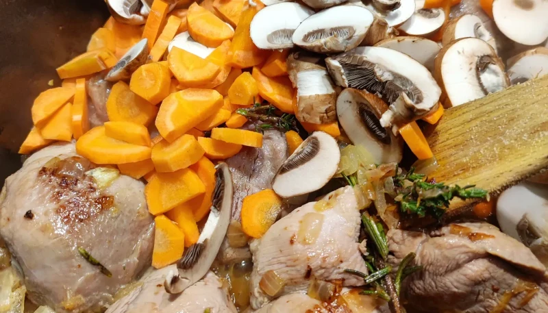 Émincer l'oignon, l'échalote et l'ail. Éplucher et couper en rondelles les carottes. Couper les champignons. Dans une cocotte en fonte, faire fondre le beurre, ajouter oignon échalote et ail et faire colorer avec le romarin et le thym. Ajouter la viande et la colorer sur chaque face. Déglacer avec le vin blanc et ajouter un verre d'eau. Couvrir à feu doux quelques instants. Ajouter les carottes ainsi que les champignons. Couvrir et laisser mijoter. Rajouter de l'eau si elle s'évapore trop. Avant de servir ajouter la crème. Saler poivrer.