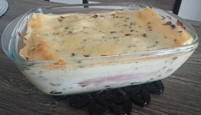 Déposez une tranche de jambon, et recouvrez d'une couche de béchamel aux champignons. Saupoudrez d'un peu de parmesan, redéposez un rectangle de pâte, puis réitérez l'opération jusqu'à la cinquième feuille.