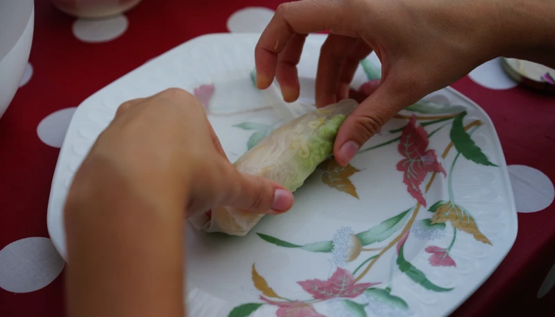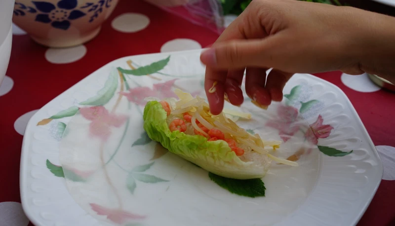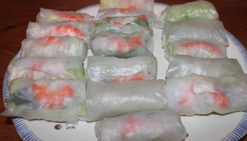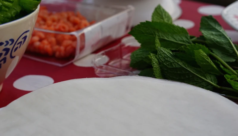 Pour monter les rouleaux, sur un bord de la feuille de riz ramollie mais pas trop au bord, positionner une crevette, un peu du mélange, un peu de vermicelle et un peu de salade. Rabattre les bord de la feuille de riz sur la préparation et rouler le tout.