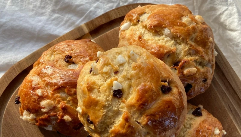 - Dégazer la pate, ajouter les raisins et le sucre perlé.