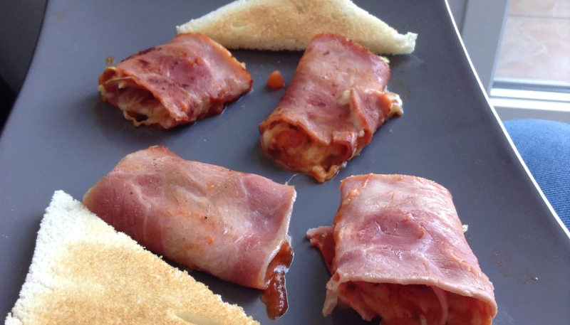 Etaler les tranches de jambon dans une poêle les unes après les autres, recouvrir de sauce tomate et de fromage râpé.