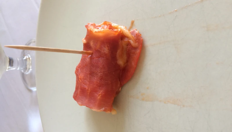 Faire cuire jusqu'à ce que le fromage fonde. Rouler la première tranche et la disposer dans une assiette. Faire pareil avec la deuxième. Servir avec des pâtes.