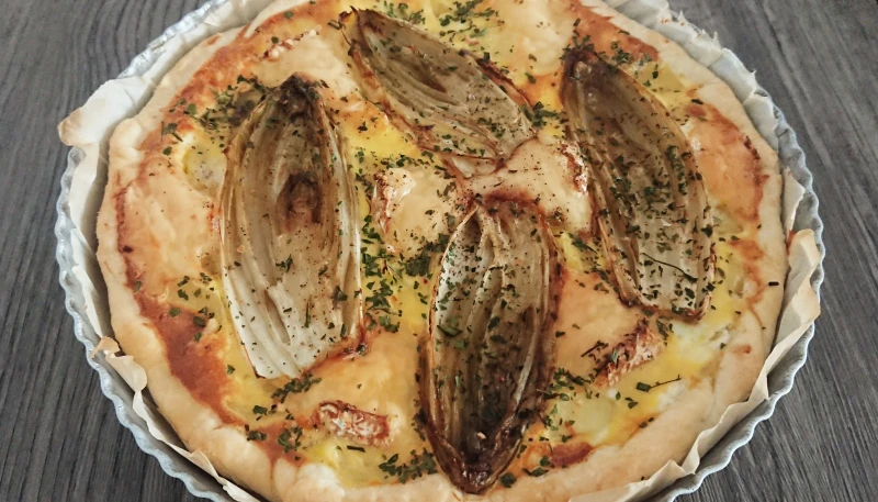 Déposez les dés de pomme de terre dans le fond de la tarte, puis les endives par-dessus.