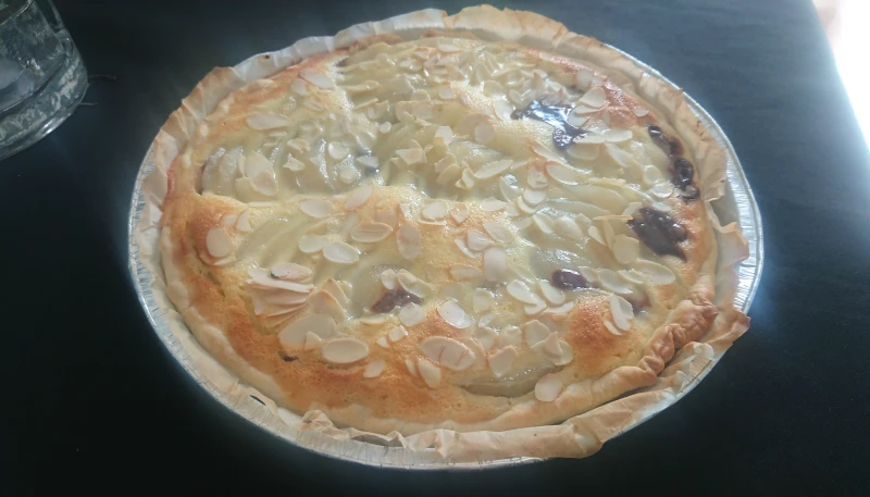 Dans un récipient, fouettez les œufs avec le sucre et la crème fraîche. Versez cette préparation sur la tarte, et parsemez d'amandes effilées.