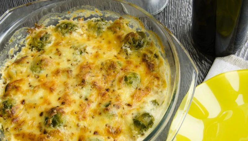 5° Déposez une couche de choux encore chauds dans le fond d'un plat à gratin, et déposez 2 tranches de fromage à raclette par dessus.