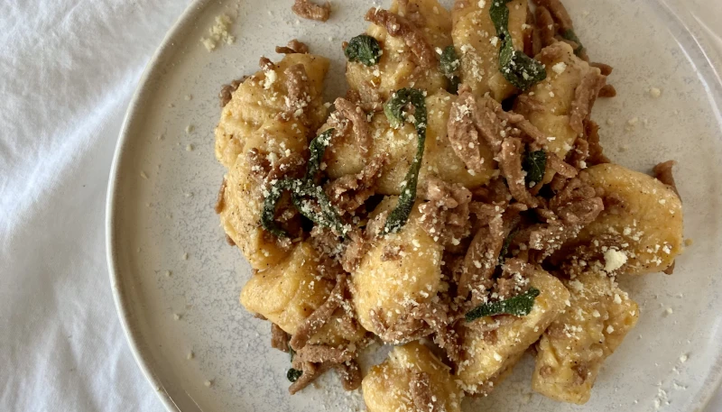 5° Faites chauffer 2 cuillères à soupe de beurre dans une poêle, ajouter les lardons et remuer jusqu’à ce qu’ils soient dorés. Ajouter ensuite la sauge coupée en lamelles. 6°Assaisonner et ajouter les gnocchis et un peu d’eau de cuisson. Servir avec du parmesan.