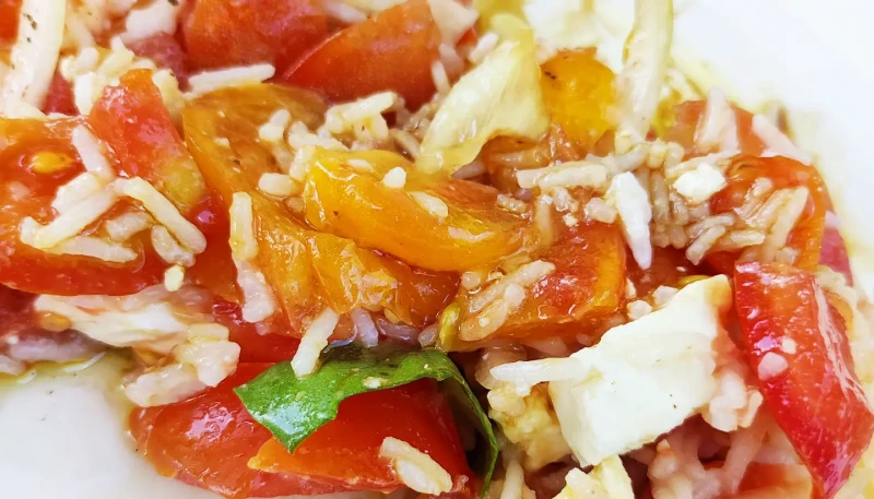 Couper les tomates en morceaux ainsi que la feta. Ajouter le riz refroidit et les carottes. Couper quelques feuilles de basilic. Assaisonner avec de l'huile d'olive et du vinaigre balsamique.