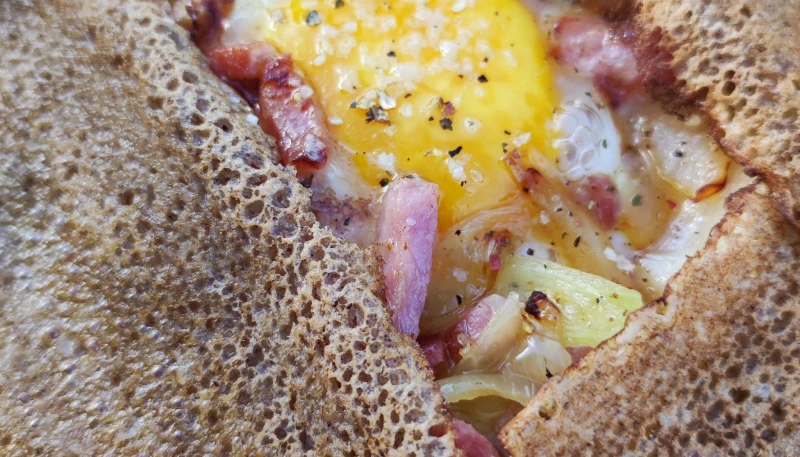1° Dans une crêpière, déposer une galette. Casser l'oeuf au centre. Disposer autour de l'oeuf du gruyère. Couper le cabecou en morceaux et l'ajouter.