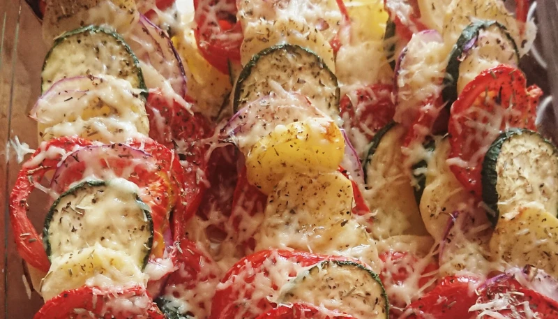 4° Dans un plat à gratin, alternez les ingrédients jusqu'à épuisement en formant des rangées colorées. Salez, poivrez et arrosez d'huile d'olive. Parsemez de gruyère râpé.