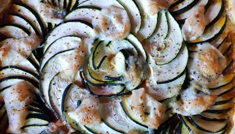 2° Couper vos courgettes en lamelles très fines. Étaler la pâte. Étaler la moutarde, le concassé de tomate. Disposer enfin les courgettes en rosace (voir photo). Couper la mozzarella et poser des petits morceaux sur les courgettes. Poivrer.