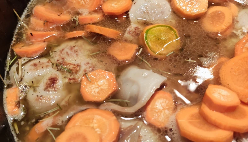 5° Ajouter les carottes, les champignons et les épices. Laisser mijoter 1 heure à feu très doux.