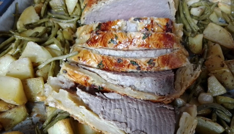 8° Tranchez le bœuf en croûte à l'aide d'un couteau électrique, et servez, accompagné de légumes. Dégustez.