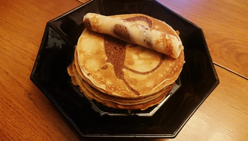 7° Versez un tourbillon de chocolat avec une louche, et complétez avec la pâte à la vanille. Recouvrez totalement. Une fois la surface sèche, retournez la crêpe avec une spatule plate et poursuivez la cuisson 2 minutes sur l'autre face. Déposez dans une assiette de service et répétez l'opération jusqu'à épuisement de la pâte.