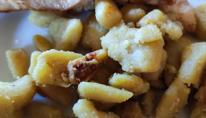4° Faites les cuire dans une eau bouillante comme pour les pâtes. (J'ai fait le choix de les colorer dans une poêle avec un morceau de beurre pour qu'ils soient dorés.). Déguster les gnocchis maison.
