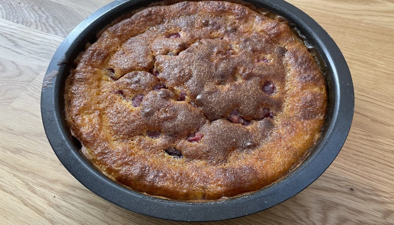 4° Verser la moitié de la pâte dans un moule de 24 cm de diamètre, préalablement beurré et fariné. Disposer les fruits rouges sur la pâte. Verser ensuite la seconde moitié de la pâte.