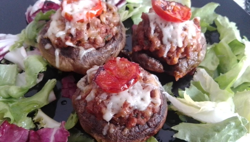 3° Garnir les champignons avec la farce généreusement et les placer côte à côte dans un petit plat à gratin.