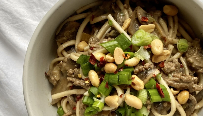 5° Quand les nouilles sont cuites, les ajouter dans la poêle et bien mélanger. Servir avec les oignons jeunes et les cacahuètes (et quelques chili flakes ici).